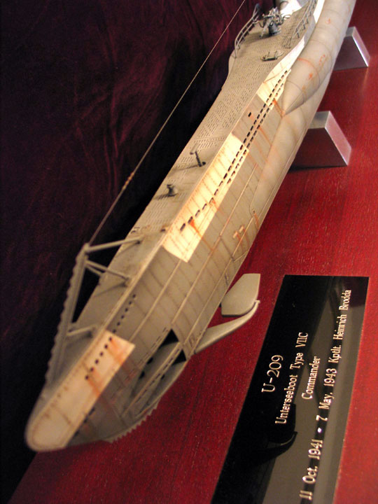 Thank you for all of the nice comments. I have to thank one of my best friends with the presentation of this kit. He is a carpenter and I asked him if he could make me a base and he made this beautiful mahogany base that you see here. It is also setting on billet aluminum mounts I had made in a machine shop. I used PE set from Yankee Modelworks Type VII U-boat Detail Set. I chose to use decals from U.L.A.D. Germany Type VIIc U-boat No: UL7202. When I saw the wood deck set from Nautilus Models I had to get it. The build took almost a month. It’s not what I would call a hard kit or I should say a complex one. It has a minimum of parts and sub-assembles. The hardest thing to do was to open all of the flooding holes in the hull. It is painted with Model Master enamels and weathered with oils and pastels. One other problem is the shear size of the kit it becomes hard to work around it and it’s so big I cant even keep at my house.