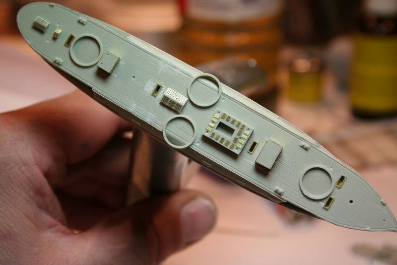 The extensive flying bridge area was much too thick, and had some odd shapes within the outline, as was the integral conning tower, which was too small... also, the 'splinter shields' that were on the real ship, were actually canvas covered railing.