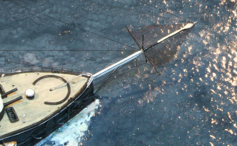 The bowsprit safety net was fashioned from a piece of fine mesh, edged with stretched sprue.