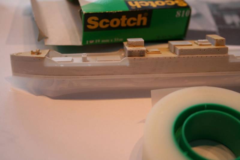 Study of photos showed visible plating runs, so I decided to represent this by the application of 3-M Scotch Magic tape. . .thin, dead matt and easy! I have no concerns about the longevity of this material, if properly sealed with varnish and paint. I have ‘plated’ some hulls in this manner in the past, and some of the models are 15 plus years old now with no sign of movement whatsoever.