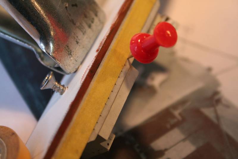 This then allowed me to create overlapping runs, and to replace and re-site the portholes according to the plans and photos. After initial painting, I ran some Tamiya masking tape along the hull at the lower end of the desired porthole positions; these were pricked through with a push-pin along the tape line prior to drilling out with a pin-vice.