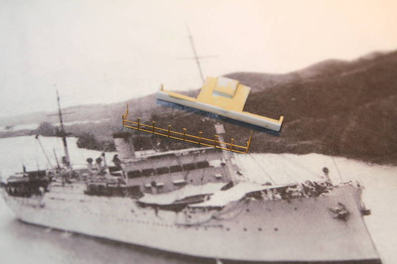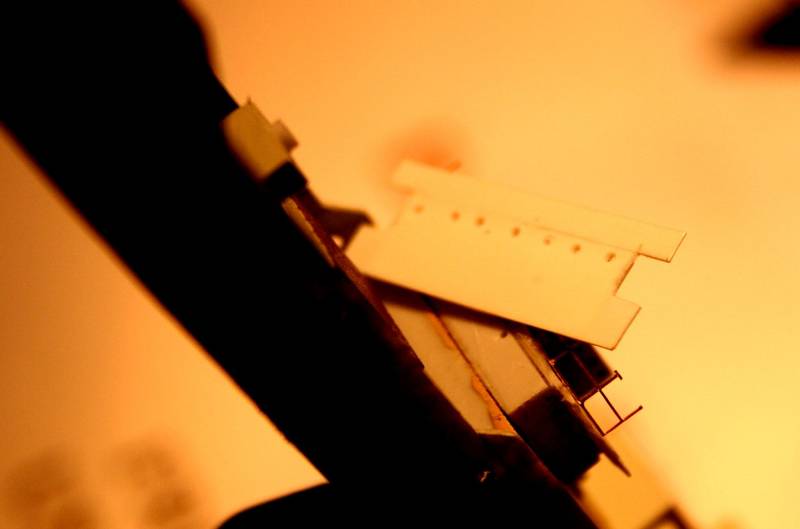 At the same time I then opened up the scuppers, and fairlead apertures, all around. . .the hull was taking life now! Due to a CA glue glitch on my part(!) the assembled deckhouse levels did not give me the completely slab-fronted look that the ships had; so I cut a new styrene overlay to smooth the area.