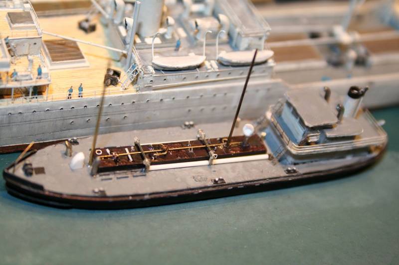 At this stage the BFM tugboats arrived, along with an oiler and a garbage vessel… these were mini-projects within themselves. The oiler had some alterations carried out to make it look like an older variant; pipe-work was added, as well as valve wheels, along with the very sturdy masts, used, I surmised, for hoisting the heavy oil delivery pipes.