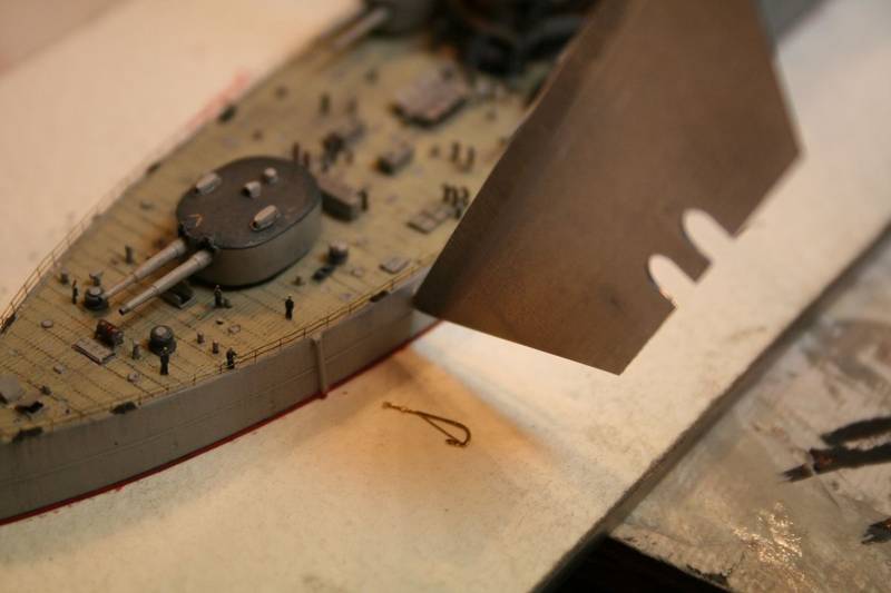 I chose for the stern section to use some PE davits from the WEM Askold set; because of the hull’s tumblehome I had problems with adhesion of the PE items due to the minimal contact surface--I cured this by cutting shallow notches by rocking a large Stanley blade into the hull