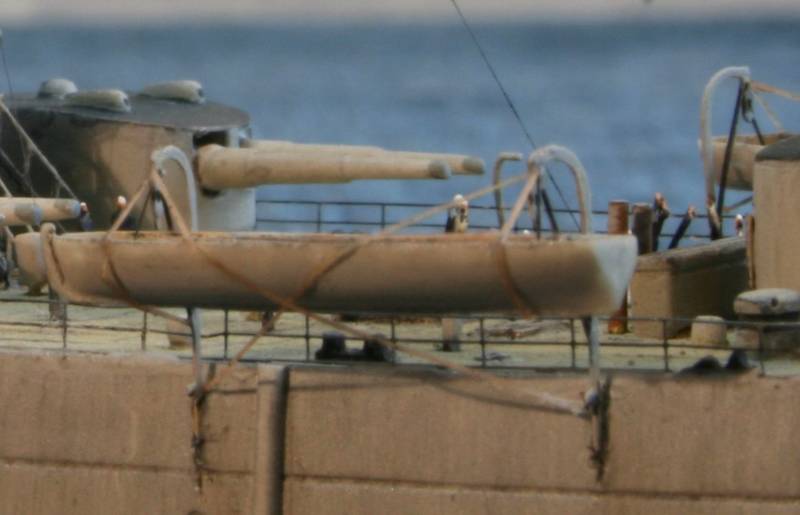 The ships boats were sharpened up a little with a blade, portholes drilled where required and the open boats furnished with oars made of brown stretched sprue with the ends flattened with pliers. The webbing strapping for the boats swung outboard in davits was made of brown sprue flattened by rolling a heavy metal cylinder over a thick ceramic tile-this could then be applied using liquid poly cement, the strapping then conformed exactly to the hull profile and had a sharp kink at the gunwale!