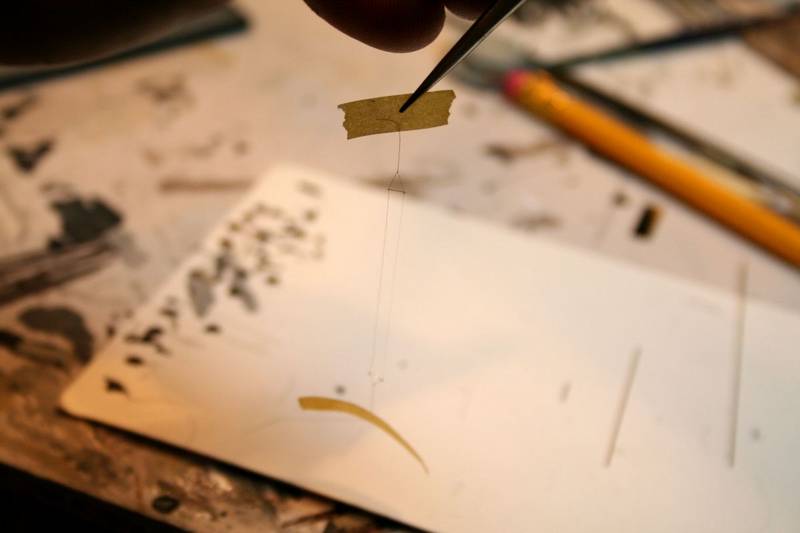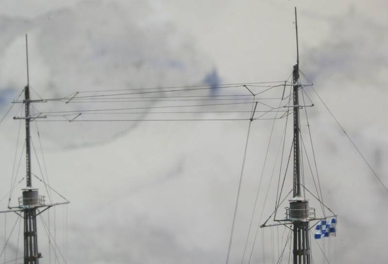The almost finished model had been earlier mounted on a calm sea of artists embossed watercolor paper and after adding about 70 crew members from GMM around the ship, she was flat-coated and ready for rigging with stretched sprue. This was done using the usual mix of Black for standing rigging and antennae; brown for signal halyards. This gives an overall lighter effect than rigging all the vertical signal halyards in black also as I had done in the past.