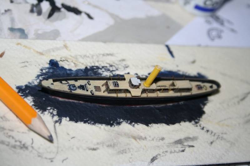 The ensign was made of paper with a blue ballpoint cross and the ship was mounted on a base of textured artists watercolour paper, painted and sealed with Glosskote varnish.