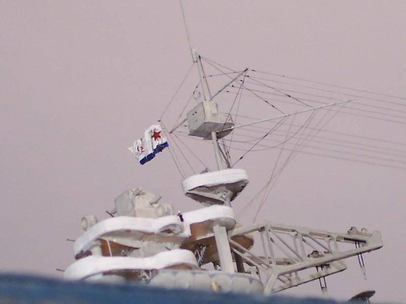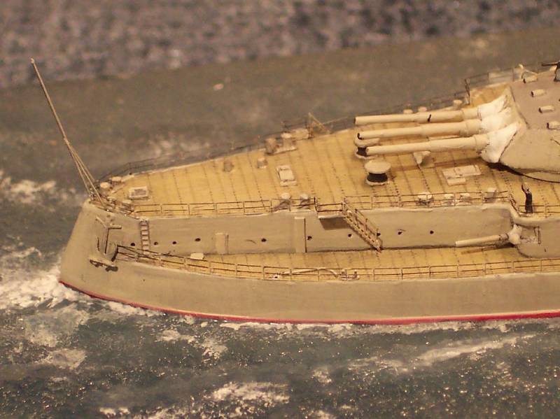 Some of the upper levels and the bridge structure were furnished with more robust items from the Peter Hall fret. The figures are GMM, stairs and anchors are WEM, the interwar naval ensign is from the venerable GMM flag decal set