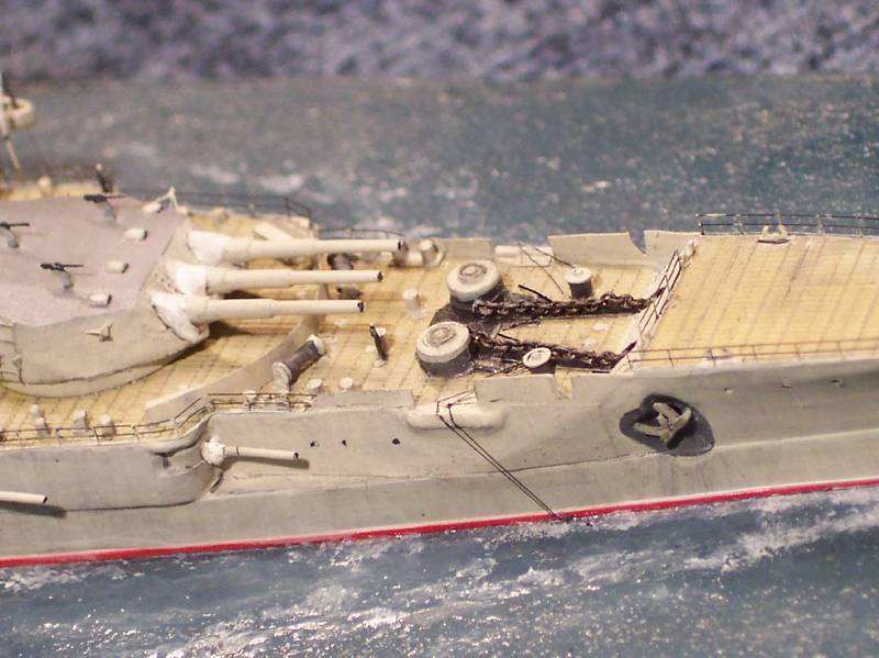 The paint used all-over was Humbrol 28--but washed down in various shades of enamel and watercolour. Lino decks were painted using WEM Colourcoats Corticene washed with light grey to knock down the intensity. Canvas dodgers were painted using Revell white--this is a creamier white than Humbrol and not as glaring on a finished model.