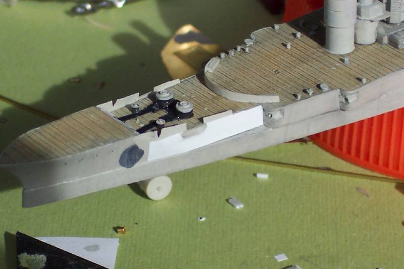 The Breakwater supporting gussets were added later using small pieces of stretched sprue then infilled with thinned white glue--this saves lots of trial and error with ever decreasing triangles. The side armour belt extended forward adjacent to the anchor handling area, this was replicated using the RC Cammet self adhesive tape for a sharp and crisp effect .
