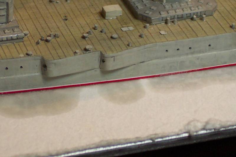 Having painted the hull and done some prelimenary weathering I applied the underwater with bootop trimline this was effeceted by first appliying some white RC Cammett tape and then covering with a strip of narrower red. The edge on the underside of the hull then had runny CA applied so as to prevent any subsequent slippage or distortion.