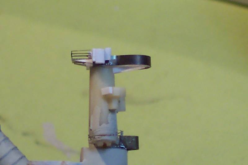The upper tapered bridge tower from the kit was very good and was used but supplemented with various small styrene additions. I needed to make a correctly shaped upper platform, the thereof 'wall' was made of thin brass ( PE scrap), the wall being painted on the inside first, then the deck was made by infilling the hole with white glue.