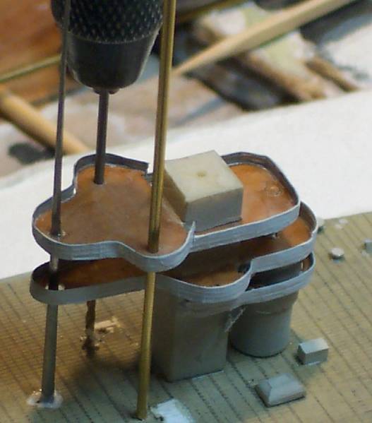 The aft superstructure was constructed partly from kit parts and new deck shapes cut of styrene sheet, as the kit parts did not match any of my drawings or photos. The main mast and crane apertures were drilled through the different levels in situ whilst checking for square. The holes were drilled somewhat oversize to allow for final setting up of verticals, the holes being backfilled with white glue .