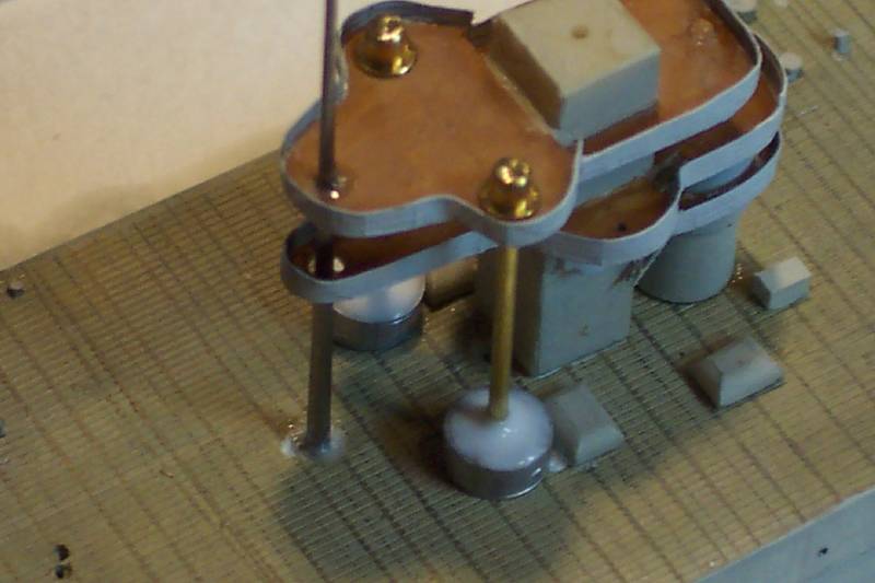 The craneleg bases were made of alloy tubing , the slightly convex tops being made with 3 layers of white glue-I find the selflevelling properties of this material to be immensly useful in 1/700 modelmaking.