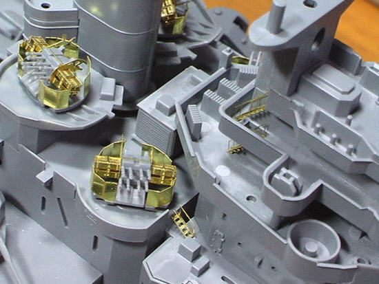 The 8 numbers of 4.25inch guns were given the PE treatment next and each of the subassemblies were left unattached to the main hull until the individual painting was done due to the complex camo of the ship during Dec 1941.