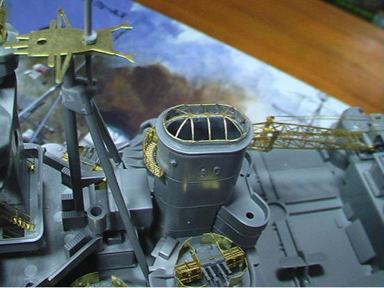 One thing to look out for when you add PE is that a lot of the join lugs and holes on the plastic either need to be filled in or shaved off as the PE will not come with lugs. This is the case on the observation deck at the funnel and also later where the inclined staircases will be. That will a huge problem because the holes are at the planked hull and the patterns will be difficult to maintain.