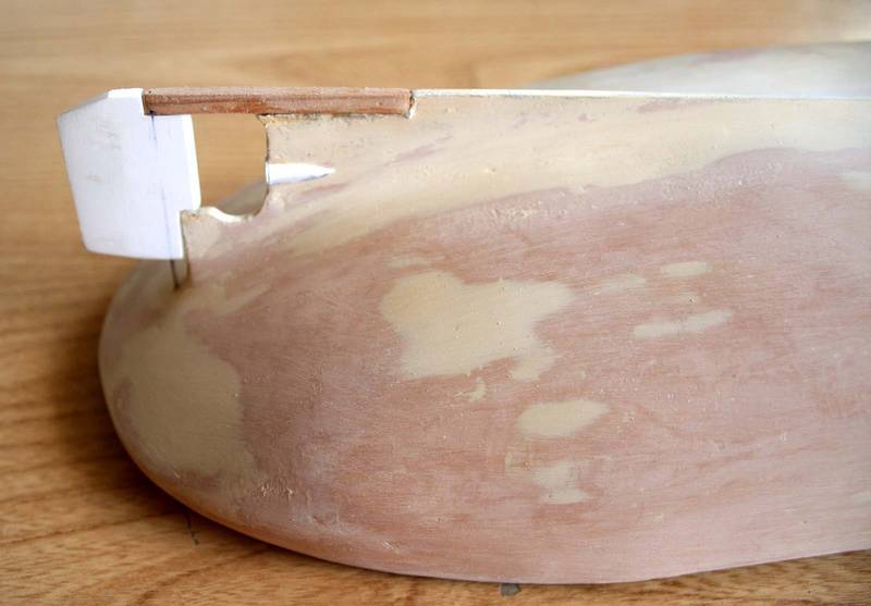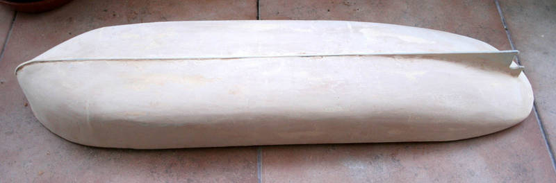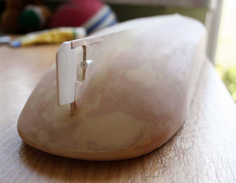 It was the time for the putty. I used acrylic type wood putty so it would not attack the Styrofoam. After every of the three coats I sanded the hull and sealed it with white glue thinned with water.