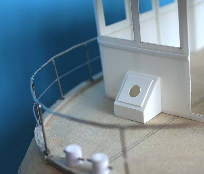 Railings were made out of wire: 0, 5 mm steel wire for vertical posts and 1mm thick copper wire (silvered) for the handrail. Handrail was soldered to the vertical posts and to top it of I have added 0,25 mm fishing line as the middle bars in the aftermost railing (a deal of cyanoacrylate glue and some swearing held this in place).
