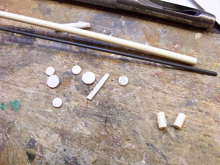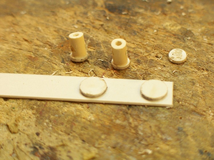 Circles of plastic were punched out with a hollow punch and two lengths of tubing cut to make up the cleat behind the wInch. The larger circles glued to a strip of plastic. Then the tubes positioned on top with a rod through them. A drop of glue inside both tubes and caps placed on top.