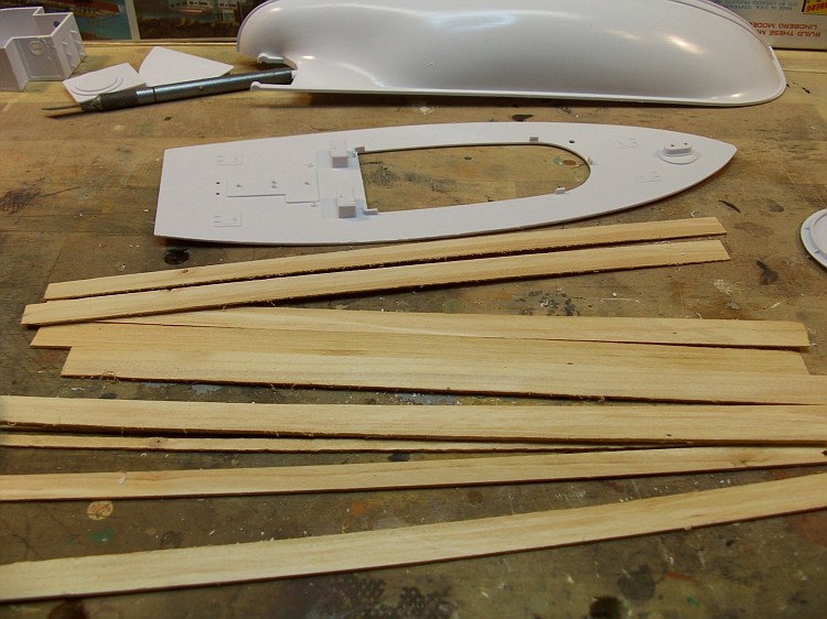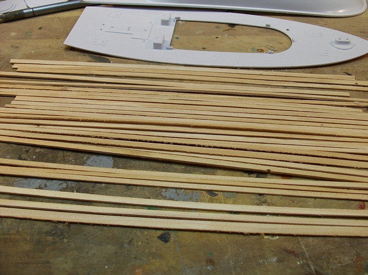 Since I wanted a more weathered look I decided to use real wood for the deck. I thought it would give the tug a more distressed look. I ripped a short length of ¾” fir into thin strips. I used a straight edge and a knife to cut the strips into boards.