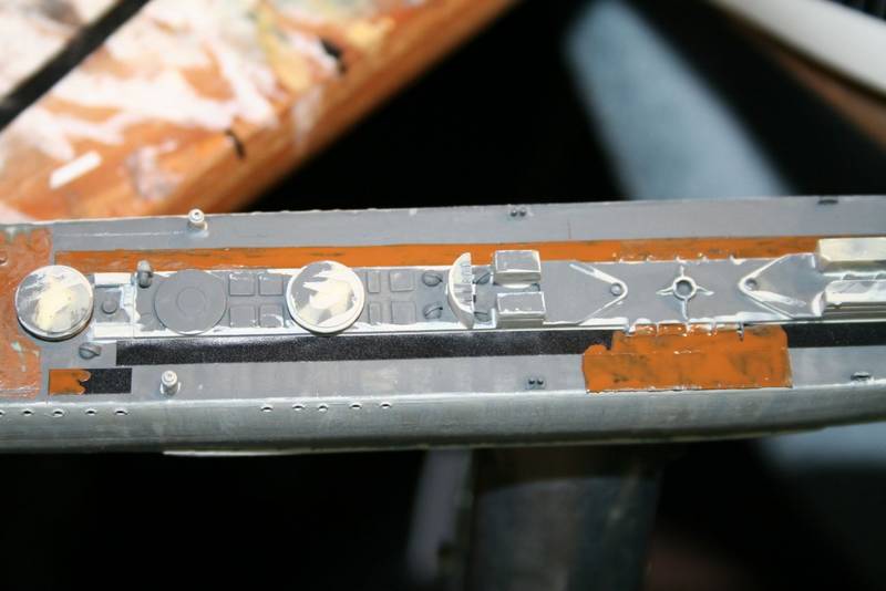 The upper decks on these vessels were covered in Corticene over steel decks, the strips of Corticene were not defined along the edges on the casting- I decided to achieve crisp edges by using the vinyl tape again cut into the appropriate sizes and shapes.