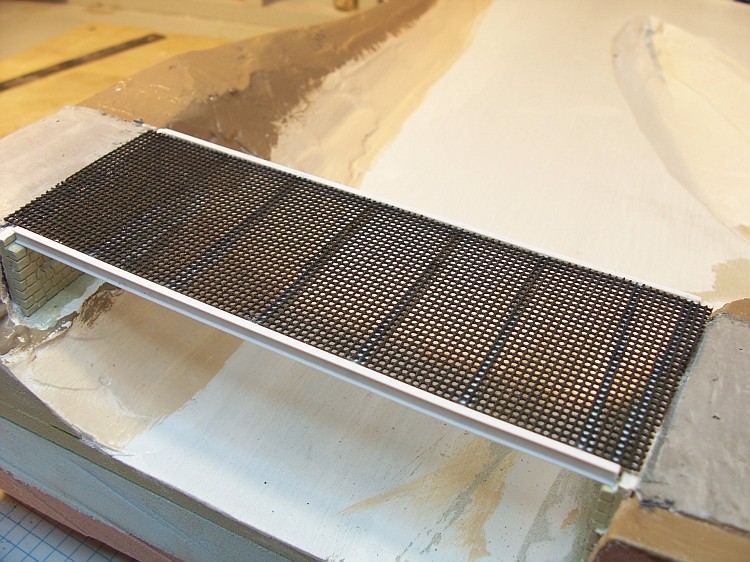 Sometimes ideas just happen. I had used drywall screen to sand the base and had some lying on my bench. I wanted an open grate type of bridge and this worked out perfect. Just cut it to fit with scissors.