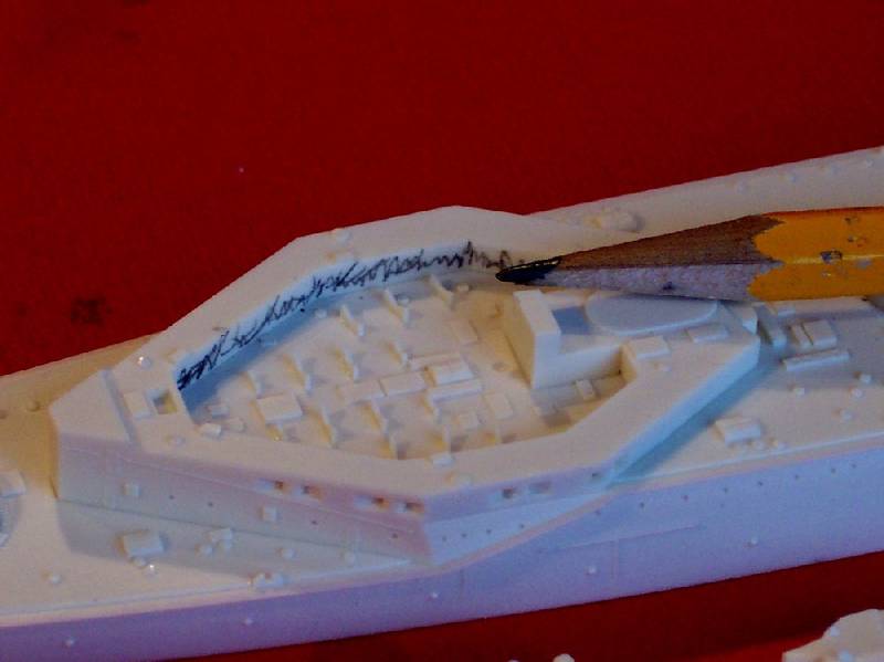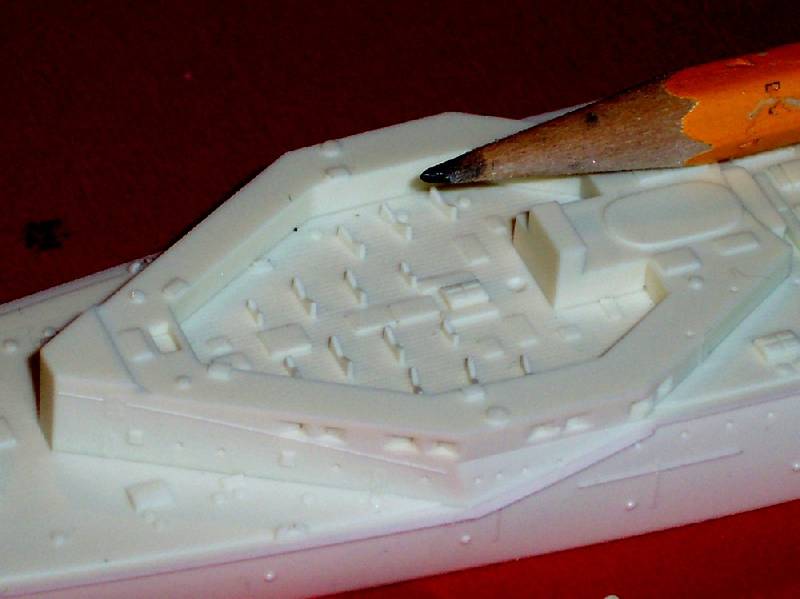 The firstmajor area that required work was the aft casemate/ boat stowage area. The outline plan view footprint was spot on, however the walkway around the top on the real ship was supported on pillars giving an undercut not represented in the kit casting-this area being solid....
