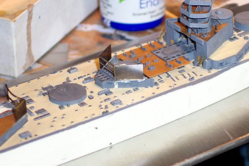 The railings were filled with white glue and the structure placed on the ship- styrene filler plates were inserted to make the aft edge flush with the base according to the photos and plans I had...