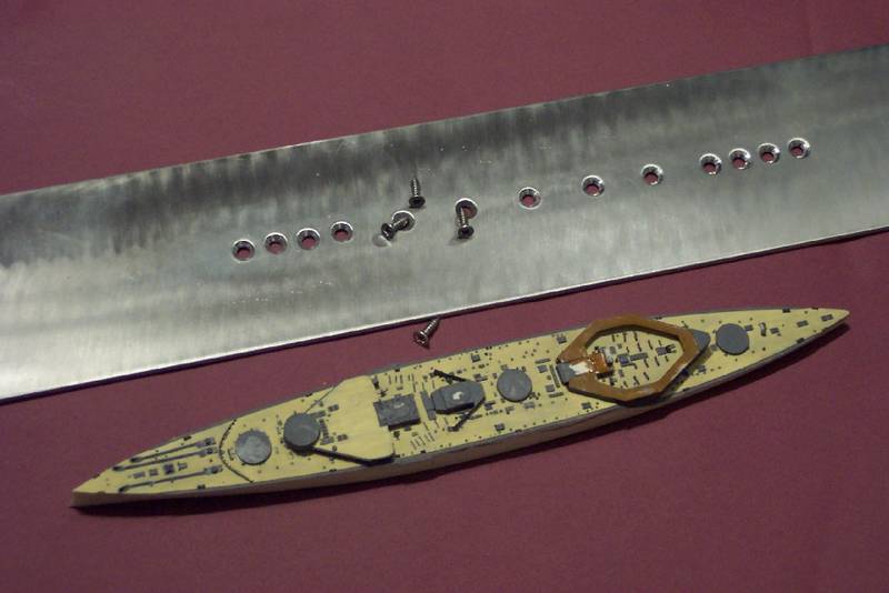 At this stage the hull was showing signs of slight warp age fore and aft... I nipped this tendency in the bud immediately by affixing the hull to a 3mm stainless steel, with stainless steel countersunk screws, into pre-drilled holes in the underside.