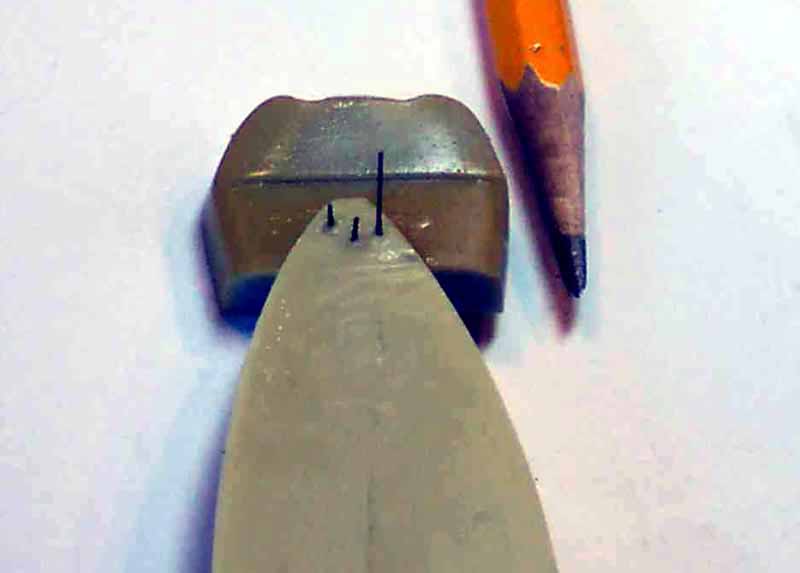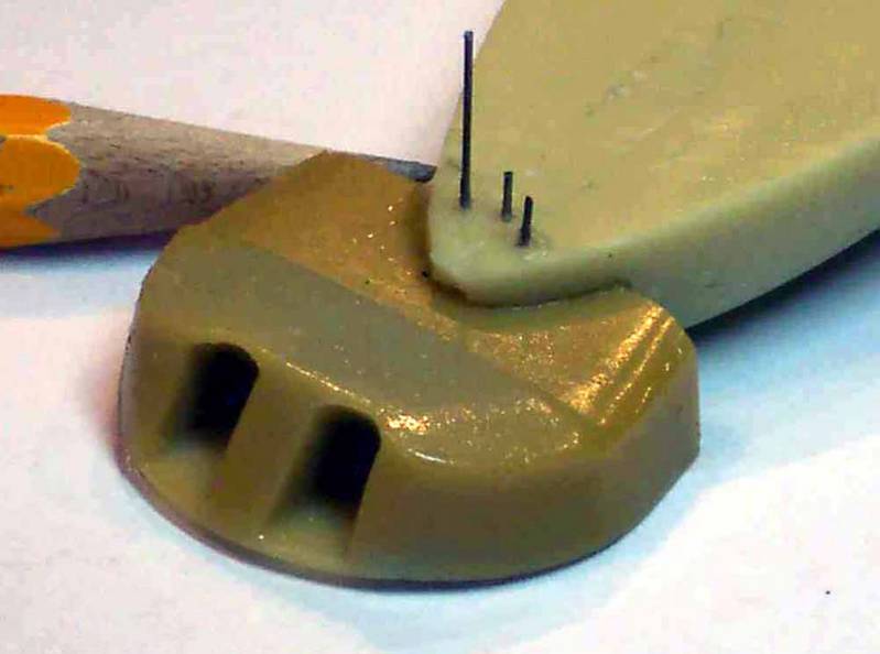 ...this was part of a discarded 1/350 WEM Hood resin turret.. So as to prevent the glue cracking under the stresses of grinding I drilled and pinned the grafted section for belt and braces security.