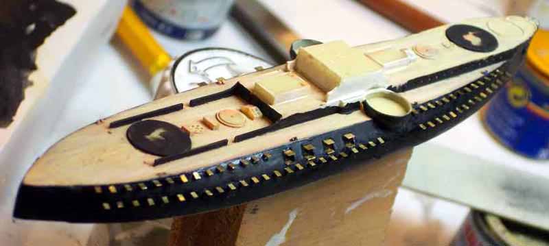 After the correct profile was achieved I turned my attention creating the missing gunports. As most photos of Pelayo show her static in harbor with all the square scuttle lids open I decided early on to portray her in a mini-diorama setting so as to use this feature to show of her tumblehomed hull shape. I used parts of the ever-useful WEM Askold PE set, the gun embrasure lids furnishing me with perfect little brass squares in a variety of sizes; in the event I needed over 150 little brass squares....