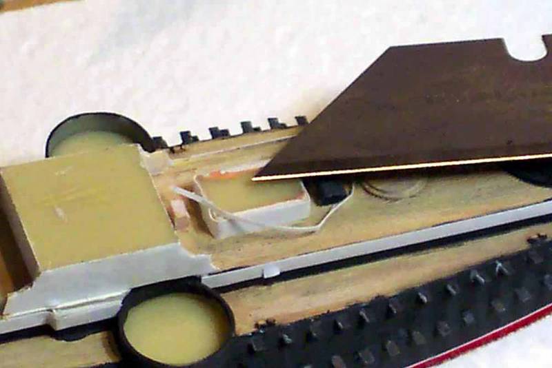 A suggestion for the next time you have to plug a large section of hull (as you did with the sacrificial gun turret in this build): try some Aves Apoxie Sculpt. It's an acrylic two-part sculpting clay. It dries super hard, sands and feathers like a dream, and it will hold an edge. You might have trouble making it out in this picture but I was able to get that end of the hull razor thin using Aves (I had to resculpt that edge after the hull took a nose-dive to the floor). I was able sand it down so sharp it became a translucent knife-edge.