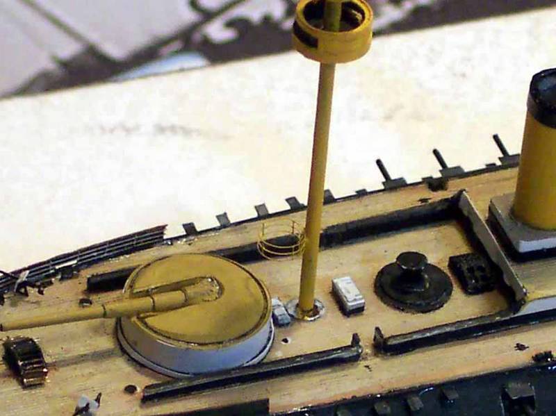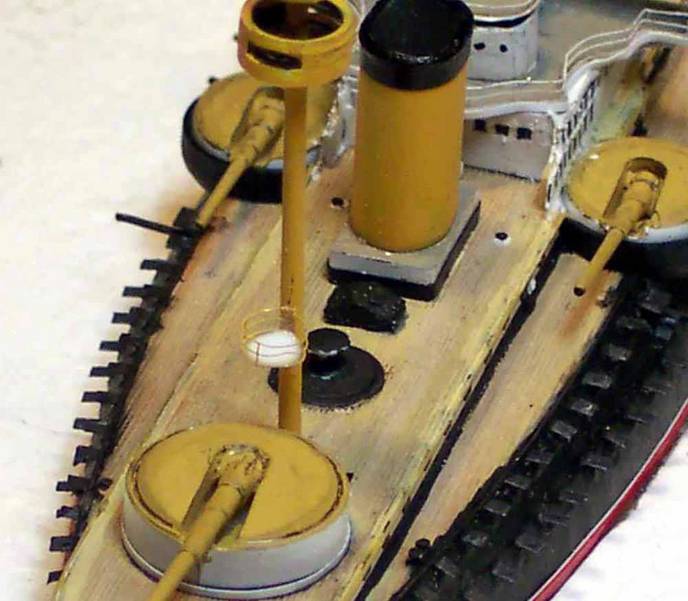 The lower searchlight platforms were made by forming a circle of PE handrail, affixing to the mast, and then painting. The open bottom of the PE rail was infilled with white glue, and when dry, it was painted from underneath; this has a two-fold advantage...keeping the rail and platform floor demarcation line perfect, as well as keeping the platform thickness to the absolute minimum.