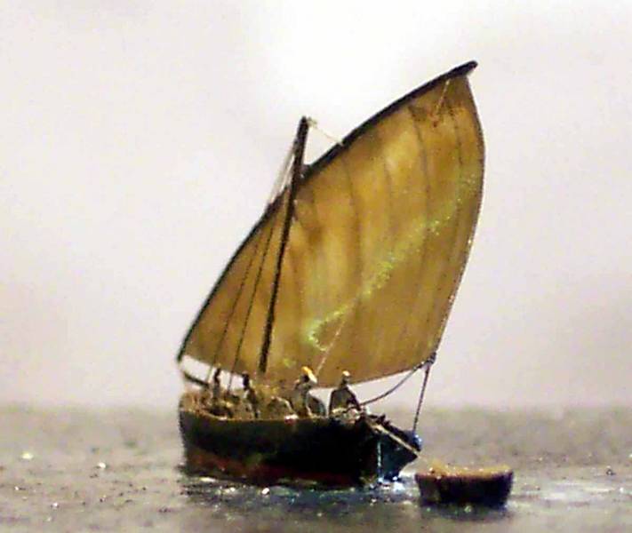 The sail was made of pencil line paneled paper, bent into shape, and infused with CA before painting, and then mounted onto a wire spar. The crew are perched around the wind-ward side, as there is very little space midships because of her cargo of barrels of water (wine?)... The rowing dinghy being towed astern was made from another spare boat that I shortened, by cutting in half and adding a new paper transom.