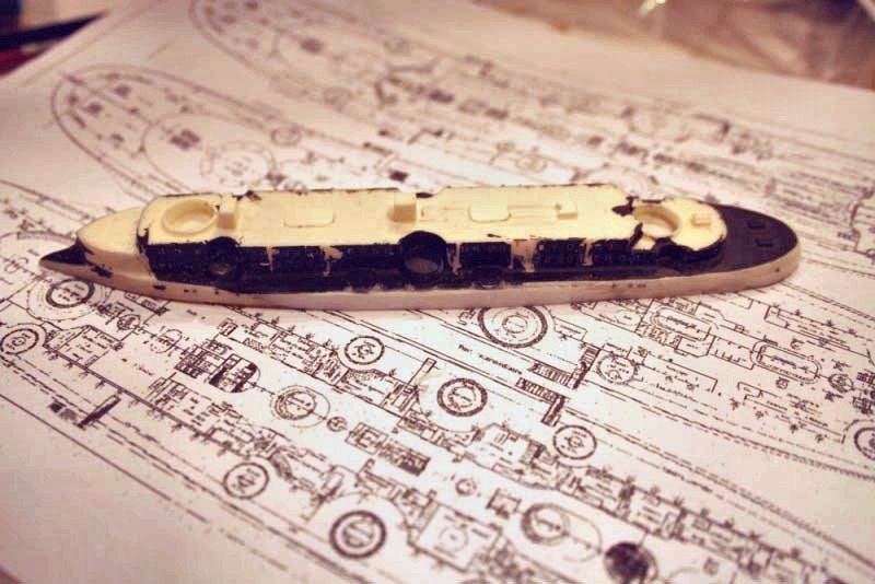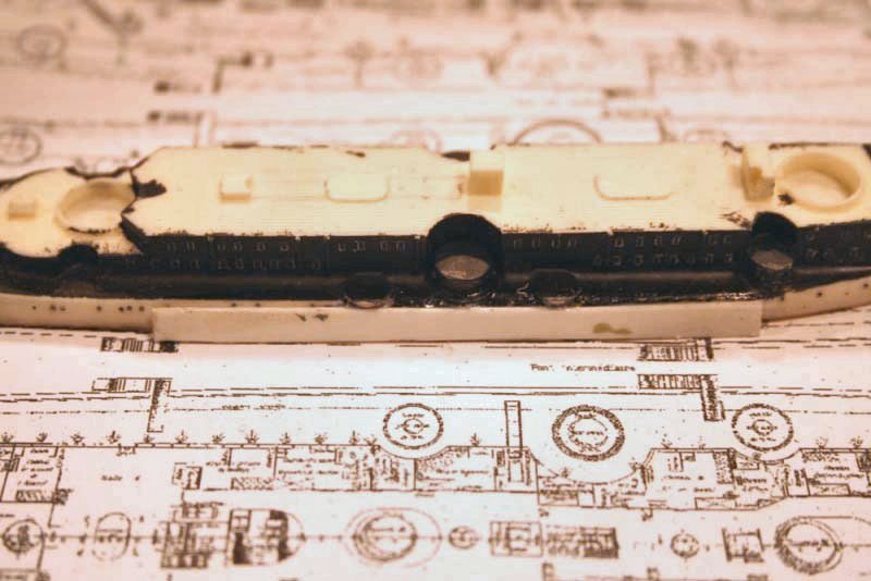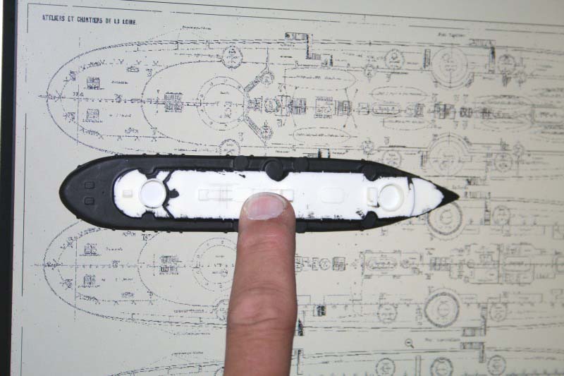 Upon checking the basic dimensions, the length overall was spot on, but the beam was to narrow, superimposing the hull casting onto plans showed the outline of the ship to be parallel when it should have been a gentle curve as well as a stern whose gentle curve was pointed.