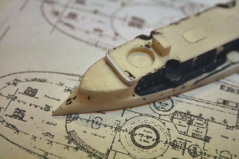 The intersection of the flat ship sides and the curved bow section was incorrectly shaped and was filled, re-cut and sanded. The snout-bow also had its top ridge sharpened, extended slightly and re-profiled...