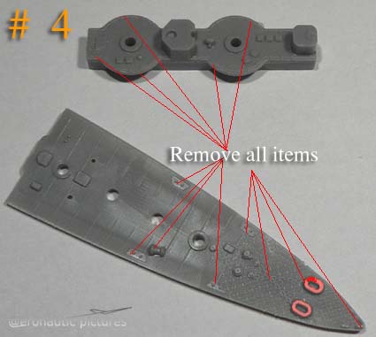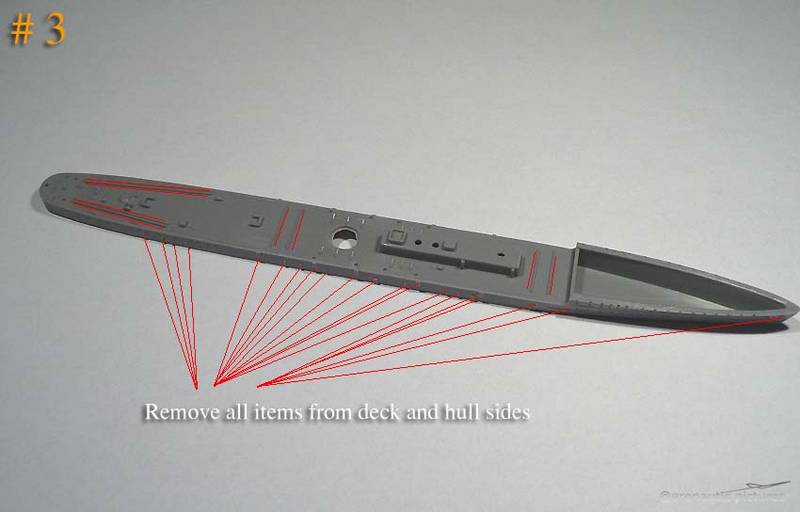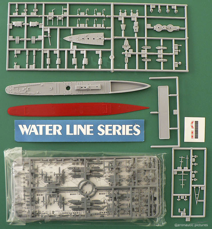 The kit comes with only one big sprue of parts, besides the typical piece of hull and red water line bottom. A big plus for this kit is the extra set of IJN extra sprue parts. Also note the little sprue of the masts at the lower right corner (this is actual from the kit of TENRYU - and the only difference between the two kits) TATSUTA comes with the single pole mast and TENRYU has the tripod-mast. I have shown the tripod-mast here, because I want to build TATSUTA as seen in 1944.