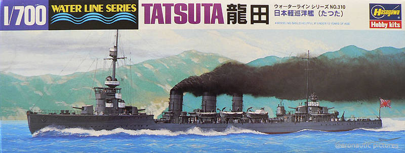 The beautiful box art shows TATSUTA in the early years of her long career, that last from 1919 to 1944, where she was sunk by torpedoes from the submarine USS Sand Lance. The picture show TATSUTA with a single pole front mast. Later in 1931 this was altered to a tripod mast. TATSUTA and her sister TENRYU was little modified during there lifetime, but closure of the superstructure with steel plates as roof and glass windows was one of the more obvious rebuilds. As well as more AA guns - TATSUTA in 1944 with 10 (2x5) 25mm AA guns.