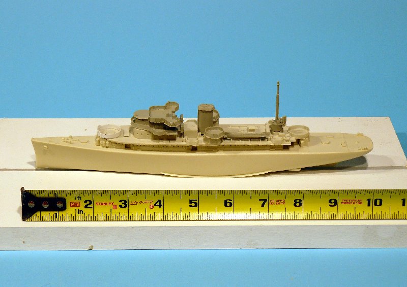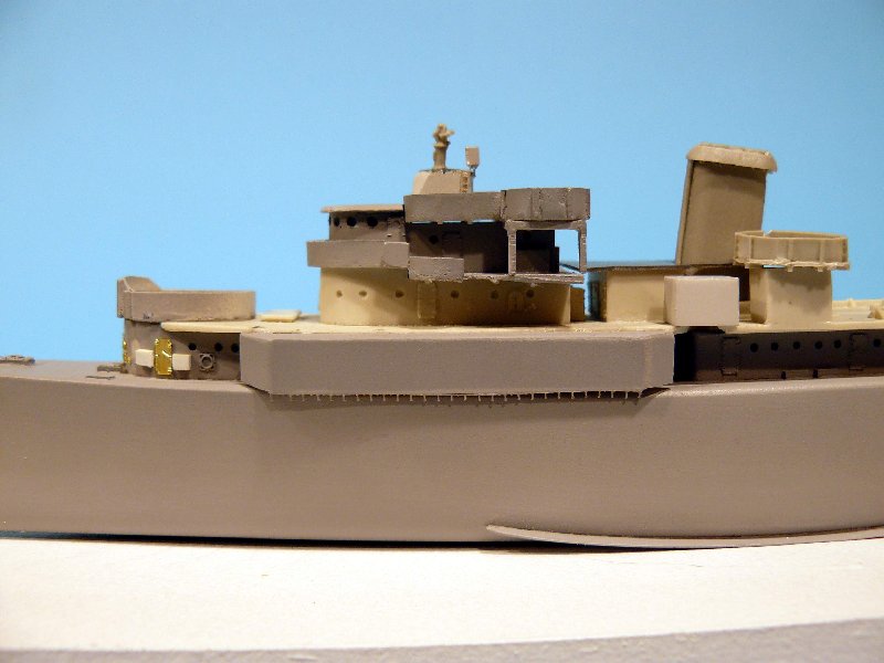 The sponsons on the O3 level were too, big and too, far aft for the Duxbury Bay, so I had to cut them off and make new smaller ones from Evergreen tubing and positioned them correctly. It is in these sponsons that the saluting gun cannons were located and I used 1/700 single 3" guns for these. From a distance, they look pretty close to the real thing.