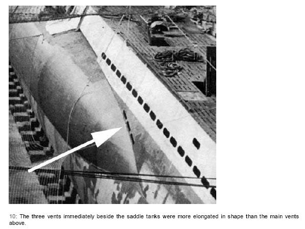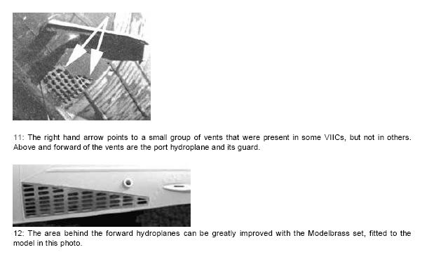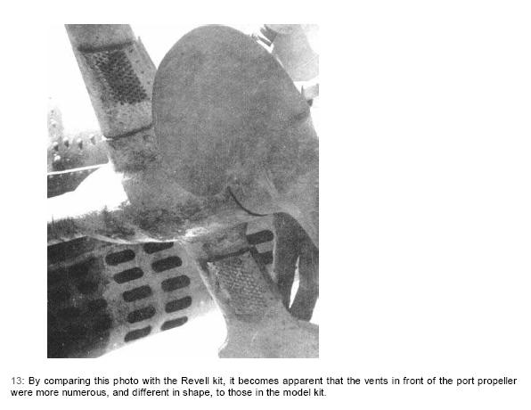 There are very few clear photos in books of the pattern of vents behind the forward hydroplanes, nor are there side profiles or drawings which can be relied upon. What can be established from these few photos is that the pattern is a little too simplified in the Revell kit and, more importantly, the vents in the kit are rectangular when they should be oval in shape.