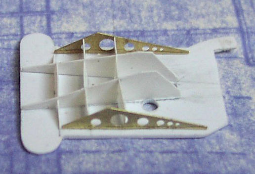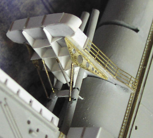 Bracketing on the underside was constructed from styrene sheet and GM PE replacements for parts D24. As with the lower platform described above, to simplify construction – and make a stronger joint - I sawed out the slot in the aft end of the stack into which I could cement the platform, rather than trying to cut an accurate semi-circle in the platform to match the slot.