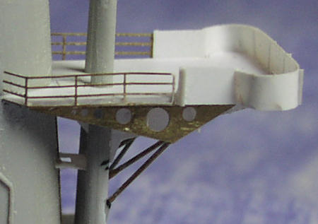 There must have been problems with vibration of this platform because additional stiffening brackets and webs were added during the ship’s life. That includes parts D21 (and their PE equivalents) under the outer edges, and tall triangular webs located on the rear faces of the struts below the platform. The four bracing rods between the struts and the underside of the platform were made from thin brass wire. There is close-up photographic evidence of an additional small platform (below the erstwhile lower platform) added late in the ship’s life between the struts and the aft face of the stack. There were no rails or lifelines on this, and it may have been added for structural reinforcement reasons.