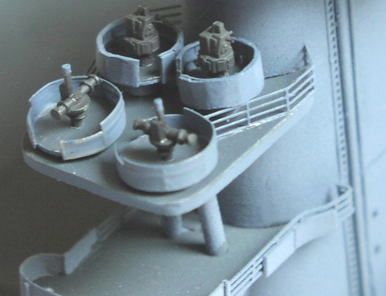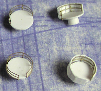 The directors were mounted on tall pedestals with circular wooden gratings for the fire-control team to stand on when operating the director. Each pedestal was made up from a piece of circular styrene sheet (the operating platform) mounted on a length of styrene tube. Two-bar railings had splinter mattresses attached to them. Note that the railings surrounded only half the operating platform on the forward directors, but on the aft directors were continuous apart from an access opening.