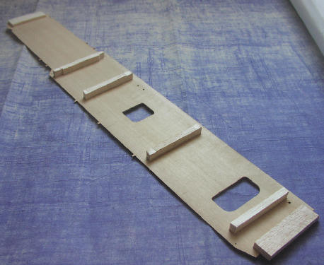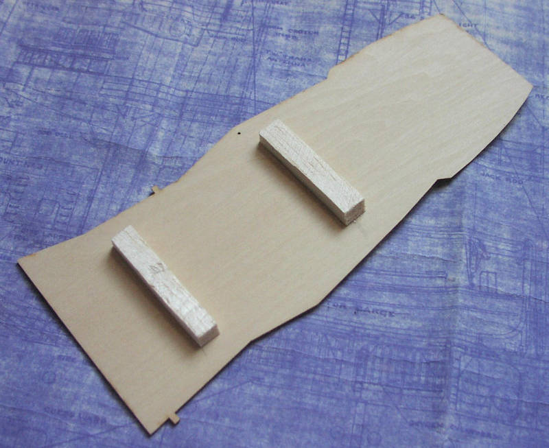 The Nautilus laser-cut wooden flight deck developed a serious distortion after I’d removed the two pieces from the panel. The edges along the length bowed upwards. To correct this is I glued suitable lengths of sturdy balsa wood stiffeners to the undersides. I used PVA glue for maximum strength and clamped the stiffeners to the flight deck panels while the glue cured. One of these was positioned to act as a supporting bridge between the two sections.