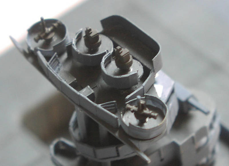 The rangefinders are not very accurate in their detail. I considered scratch built replacements, but decided the scale is simply too small to make this worthwhile. Instead I adapted the existing parts. The over-scale end caps were reduced in size and the central dome removed. This was replaced with a short vertical length of rectangular section styrene representing the base of the height-finding unit. To the rear of this and off-centre, a length of vertical styrene rod represented the height-finding tube. The rangefinder pedestals were too high, but there had to be a secure way of fixing them into the deck. I left the mounting spigots in place but sliced away the circular bases above them. This allowed me to insert the units into the deck with adjustment for height.