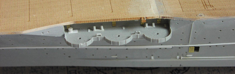 The forward edge of the flight deck was sawn off the moulded flight deck part in the kit and cemented to the bow. The aft round-down had already been similarly sawn off and cemented in position as part of the aft deck assembly stage. For some odd reason, the forward flight deck in the kit and the Nautilus equivalent is very slightly wider on the port side than the starboard side. I can only presume that Nautilus followed the outline of the Trumpeter part in order to create a matching like-for-like replacement. It should be symmetrical, but visually this error is not intrusive and is easy to live with. But do make sure the forward edge is positioned laterally so that it aligns with the flight deck.