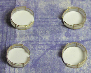 The rails were made from three-bar rail with the lower rail removed, and the upper rail removed at the ends to give the characteristic stepped-profile. These were fixed to circular styrene platforms and the effect of the canvas dodgers created by in-filling the rails with PVA glue.