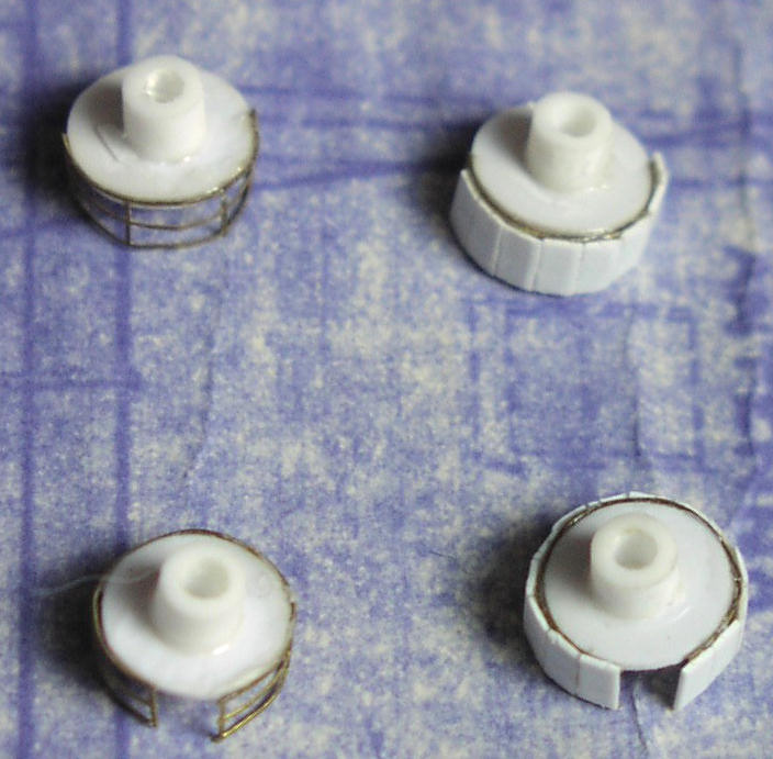 Tip from experience: To airbrush paint these small items, apply double-sided adhesive tape to a piece of scrap wood, styrene sheet, or whatever comes to hand. Put the items to be sprayed on the adhesive tape. They will stay in place and can be easily removed afterwards.