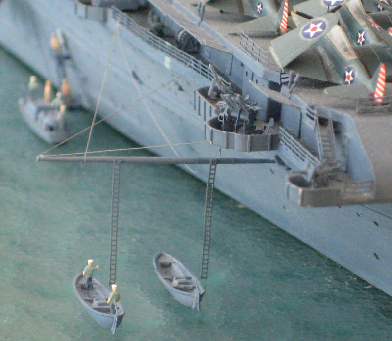 I decided to portray the Lexington as though she is at a couple of hours notice before sailing. Preparations are being made to hoist up the side ladders when the small boats alongside have cast off. So I ran hoist ropes (monofilament) from the derricks down to the ladder platforms.