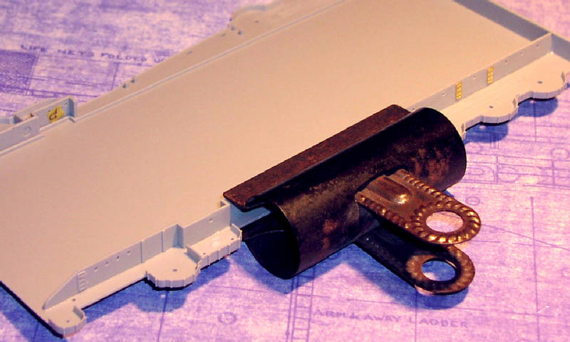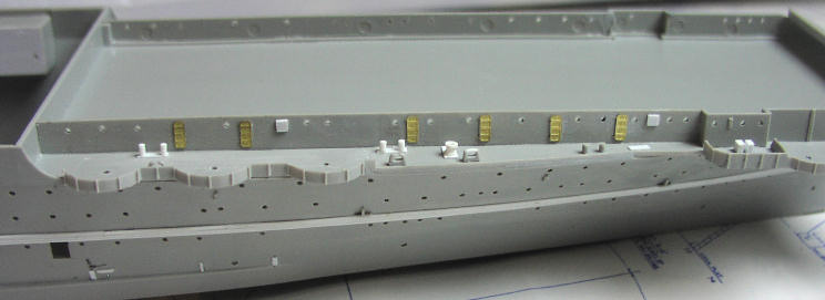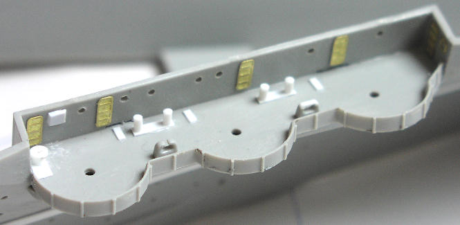 There are a large number of circular moulding depressions in the underside of the aft deck and 5-inch sponsons which deserve filling. Given the size of the model and the fact that it is likely to be critically examines at close quarters from different angles, these will definitely show up if they aren’t filled. Curiously, the starboard light AA sponson beneath the 0.5-inch mounts has a rectangular recess, whereas that on the port side doesn’t. This was filled.